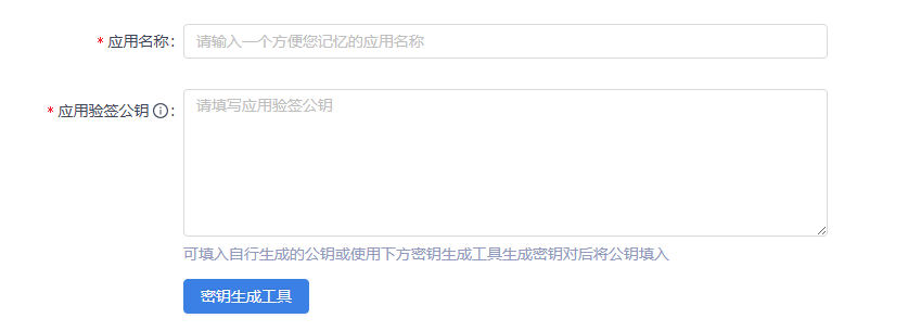 3.确认应用名称,填入自行生成的公钥或使用密钥生成工具生成密钥对后将公钥填入
